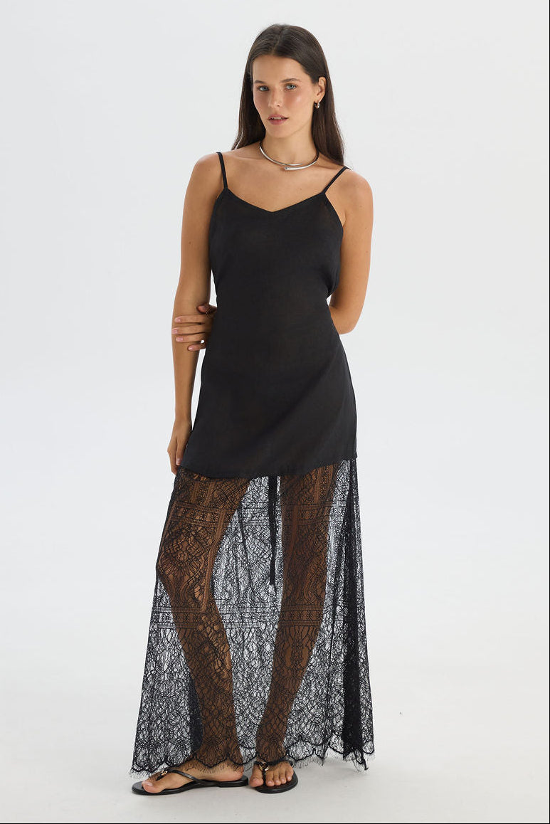 A captivating blend of minimalist elegance and daring texture. This floor-length masterpiece features a sleek, silk-like mini slip bodice that flows into a stunning, sheer lace overlay, creating a beautiful play of light and shadow. With its delicate, adjustable straps and a graceful V-neckline, the Santini dress perfect for high-glamour evening events or moonlit soirées.