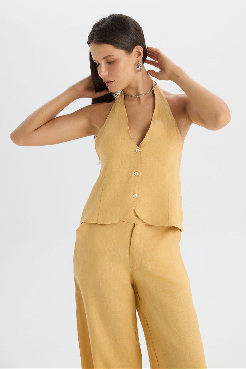 Sophisticated vest-style silhouette that balances classic structure with a relaxed, feminine charm. This sleeveless piece features a deep V-neckline and a polished button-down front, leading to an elegant open-back design with delicate halter-style ties for a customizable fit. It is the perfect choice for an effortlessly chic daytime look.